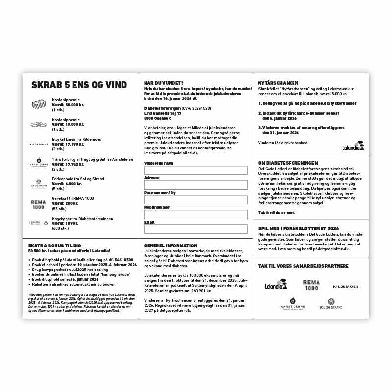 Med Diabetesforeningens Julekalender får du 24 dages julehygge, spænding og mulighed for at vinde flotte præmier. Den helt store gevinst er på 50.000 kr. – måske bliver det dig, der kan glæde dig ekstra meget i julen. Du kan også vinde et gavekort til Lalandia og til alle er der en rabat på 500 kr. ved booking af ophold hos Lalandia.